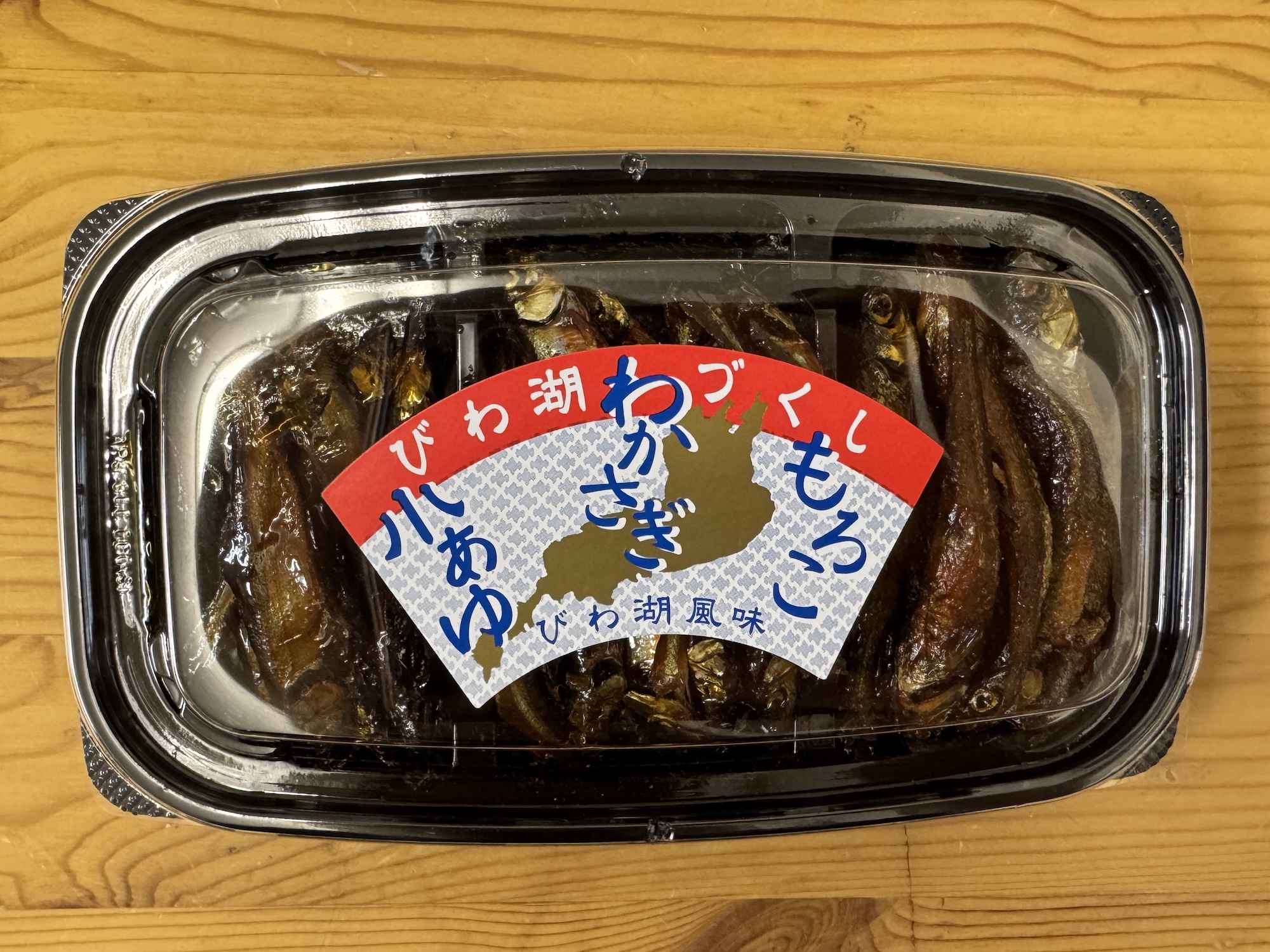 琵琶湖でとれた「小あゆ」「わかさぎ」「もろこ」を使った佃煮を食べ比べできる便利なパック。「もろこ」とは初めて聞いたが、琵琶湖固有の魚だそうです。琵琶湖は広い。