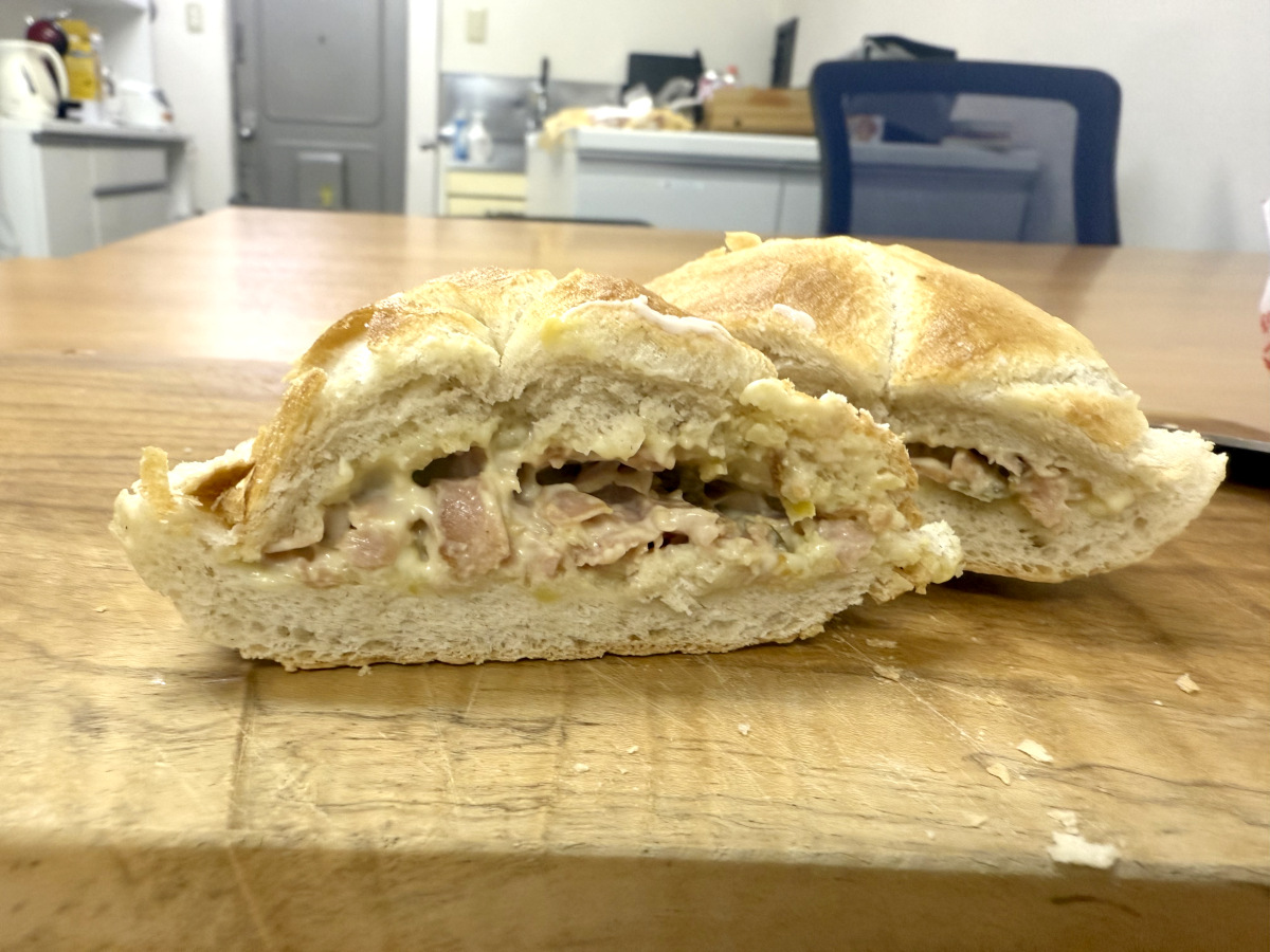 オーブンで焼き上げたパンをカットし、熱々のソーセージとたっぷりマスタードをサンドしたらドイツのおふくろの味「レーバーケーゼゼンメル」が完成。急いで会社に持ち帰り、いただいてみることにした。