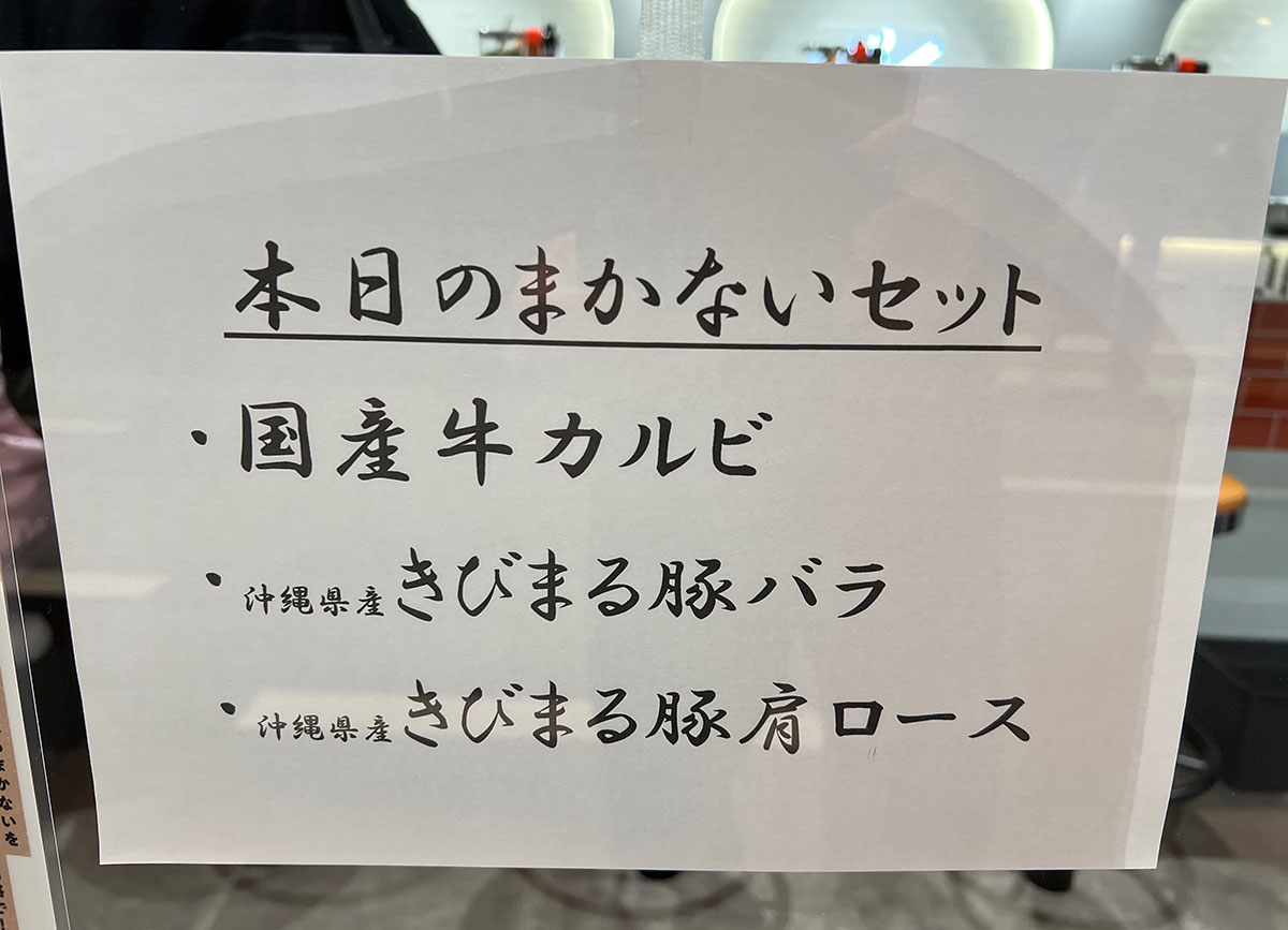 入店して「まかないセット、まだありますか?」と聞くと、店員さんの方から「本日は国産牛カルビ、きびまる豚バラ、きびまる豚肩ロースになりますけど、よろしいですか?」と確認が。