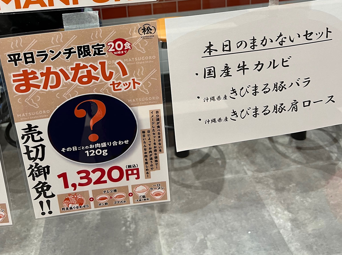 店の前に貼られたポスターによると、価格は1320円。野菜とご飯に ひと口ラーメン等がつくセットのようで、メインのお肉が日替わりで秘密……ということらしい。ちなみに、まかないセットは平日ランチのみで、1日20食限定とのこと。