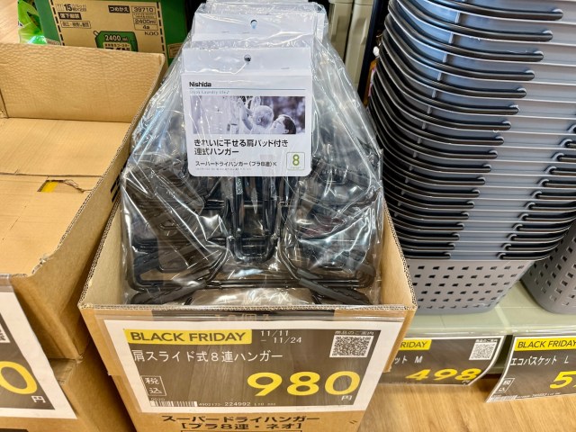 カインズのブラックフライデーは生活家電以外にも雑貨や食品も狙い目。スライド式8連ハンガー(980円)とか、実は使える優れモノをお得に購入できるチャンスだったりする。思わぬ掘り出し物に出会えるかもしれないので興味があればのぞいてみてほしい。