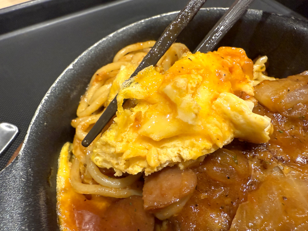 また鉄板の下に敷き詰められた卵焼きもいい仕事をしている。口の中が酸味でやや強くなった時も、卵焼きがそれをやわらげてくれるのだ。ふむふむ、西条てっぱんナポリタンとはこういうことか。