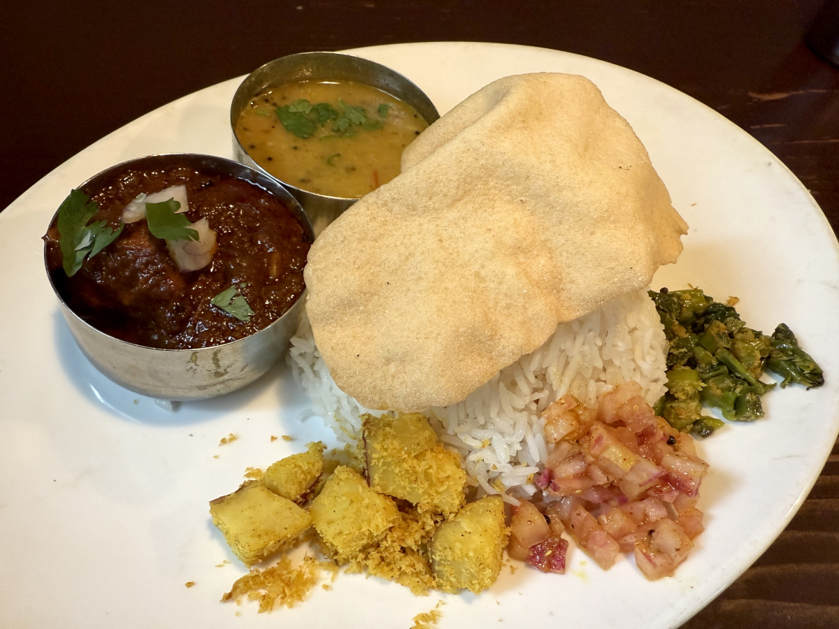 ただそれも優しい味わいの「ダルカレー」を挟むことでコントロールが可能。ダルで口をリセットしたら、また新鮮にポークビンダルが食べられる。もちろん混ぜてもウマかった。