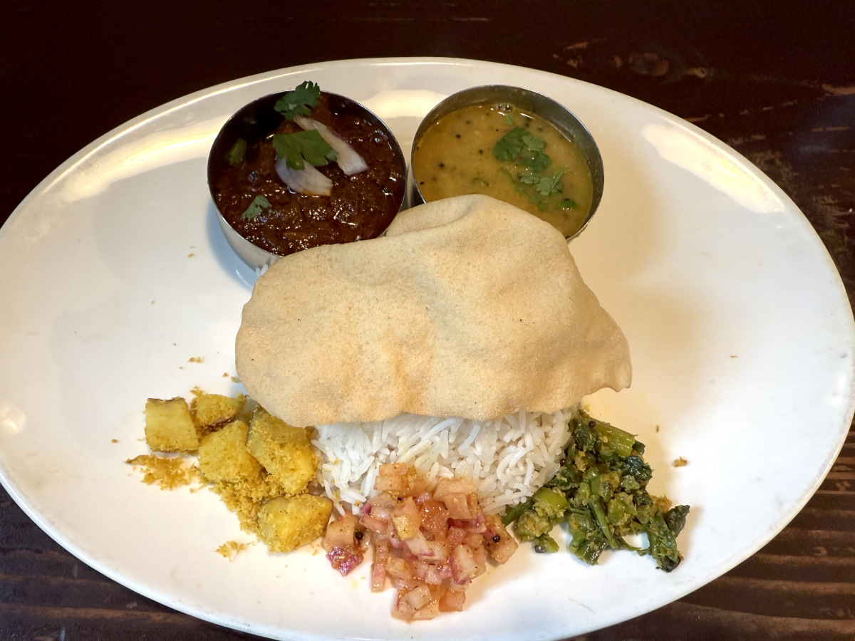 待つこと数分でやってきたのは、インドスタイルのカレー。ライスの上のはパパド(薄焼きのせんべい)がのっており、アチャール(付け合わせ)も3種類が並んでいる。