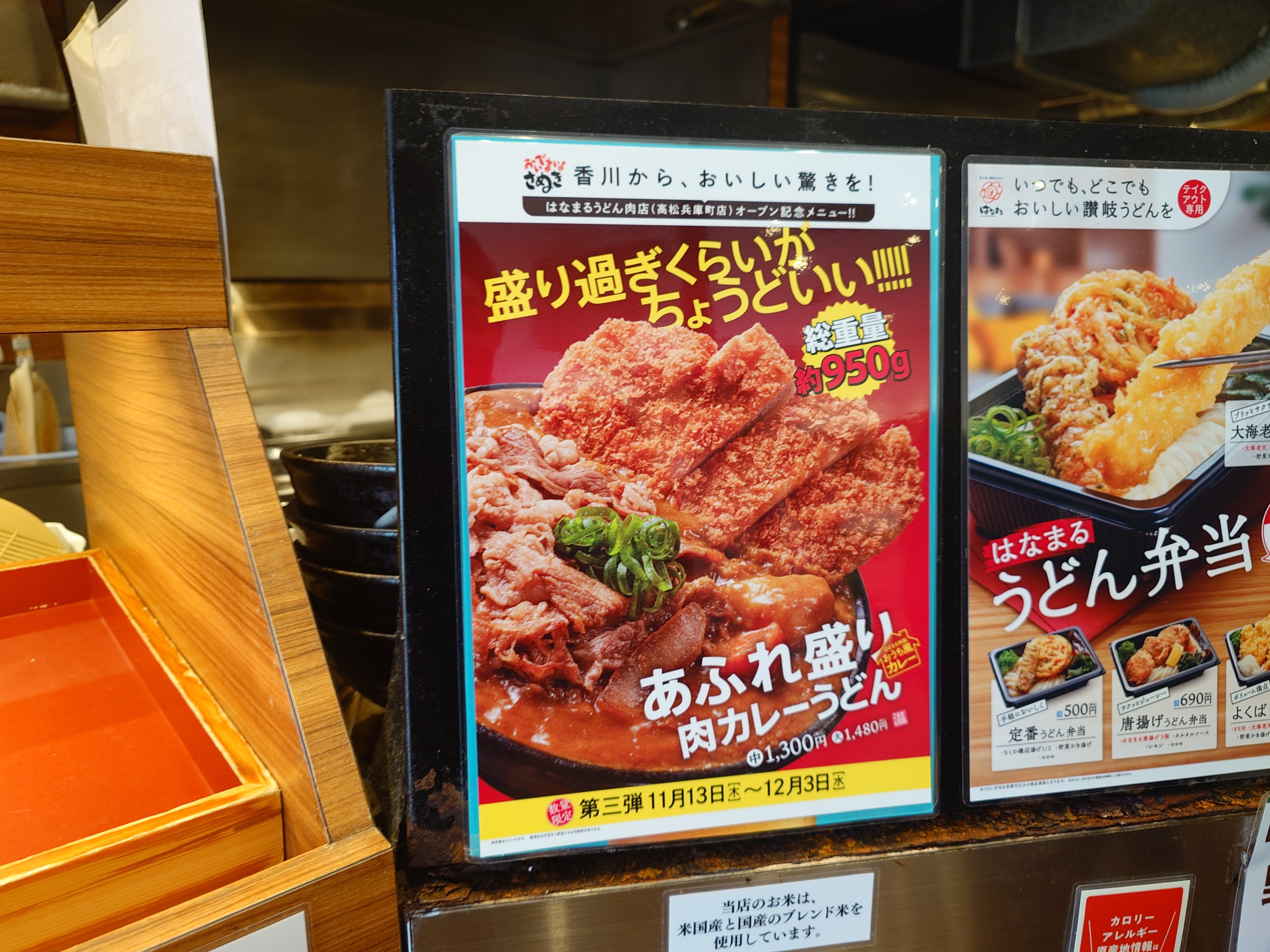 「あふれ盛り 肉カレーうどん」だ。公式HPには 総重量約950g と書かれている。中は1300円で、大は1480円。ちょうど腹が減っていたんだ。今日はこいつにしよう。