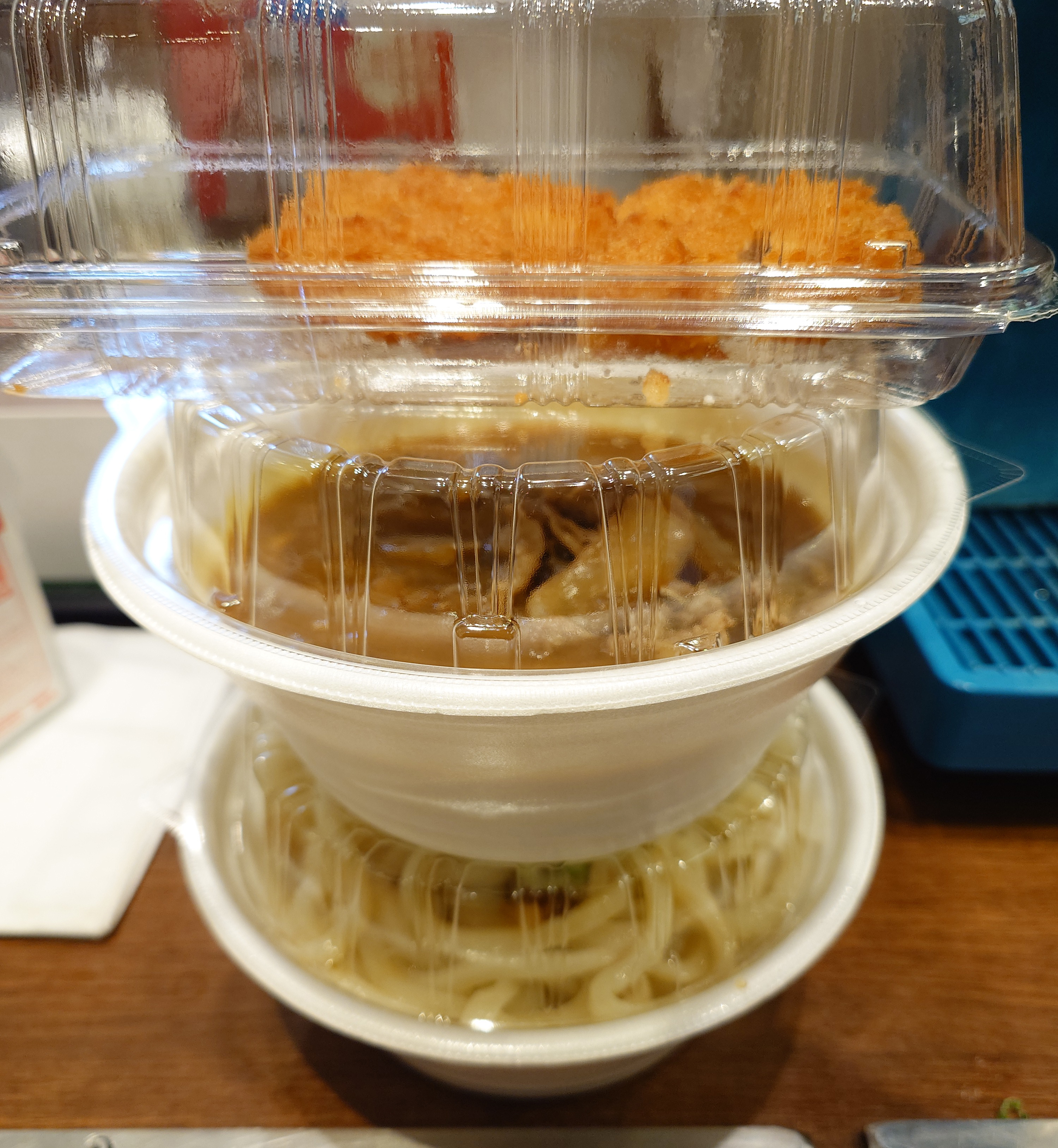 ということで販売店舗へ。今回は重量を計測したいのでテイクアウトした。「あふれ盛り 肉カレーうどん」の販売店舗および、テイクアウト対応店舗の一覧は公式HPから確認できる。