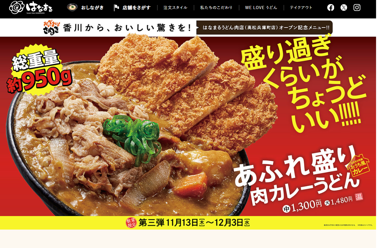 はなまるうどんが、11月13日から12月3日の期間限定で、食べごたえのありそうなカレーうどんを出している。