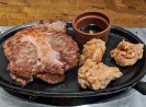 「コンボA(がっつりステーキ+ハンバーグ)」のハンバーグ300g、ステーキ150gを注文したところ、目の前で店員さんがハンバーグを切ってくれて、静岡の『さわやか』みたいだった。それにしても、ハンバーグとステーキだけじゃなく……