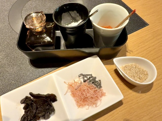 人によって全然違う感想になりそうで、周りのテーブルの人に聞いて回りたくなるが、筆者はシンプルに塩&唐辛子がベストだと結論づけた。組み合わせを変えて、好みの味を探っていくのがかなり楽しい。