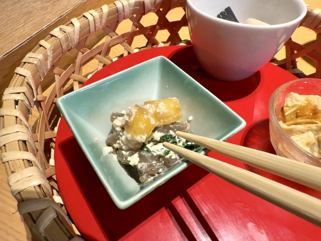 「お楽しみ膳(税込3960円)」「京の湯とうふ膳(税込6490円)」「おとうふ湯葉膳(税込6600円)」と京都らしい御膳料理が並ぶうち、筆者はカジュアルなお楽しみ膳をオーダー。