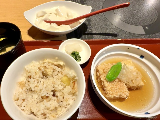 〆は「お揚げとさつまいもの炊き込みご飯」だ。少食な人なら、豆腐のおかわりをせず御膳の料理を順に食べるだけでもそれなりに満腹になると思う。