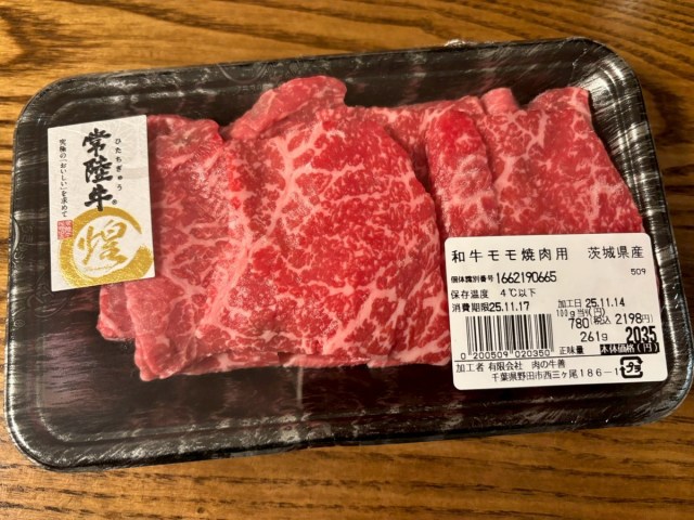 私はさっぱりしたお肉が好みであるのと、今回は自宅での焼肉利用をイメージして茨城県産常陸牛のモモ焼肉用を250g購入。