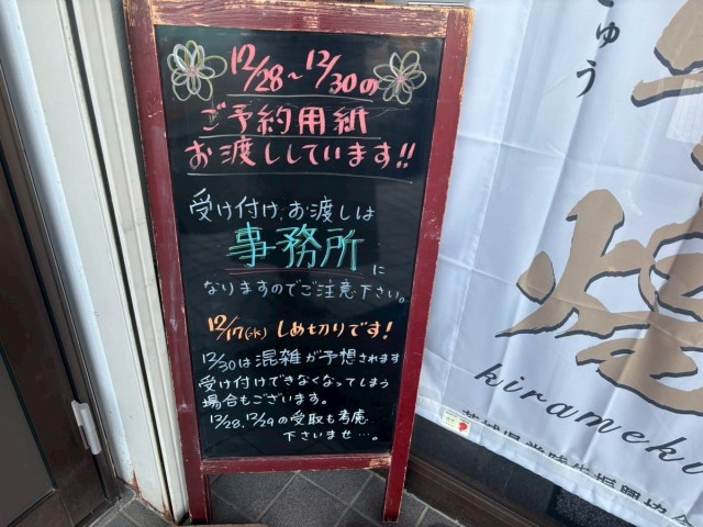 なお、年末は例外的に12月26日〜30日も営業予定とのこと。とくに混み合う12月28日〜30日は予約販売のみの対応となるため、12月17日までにご注文を。