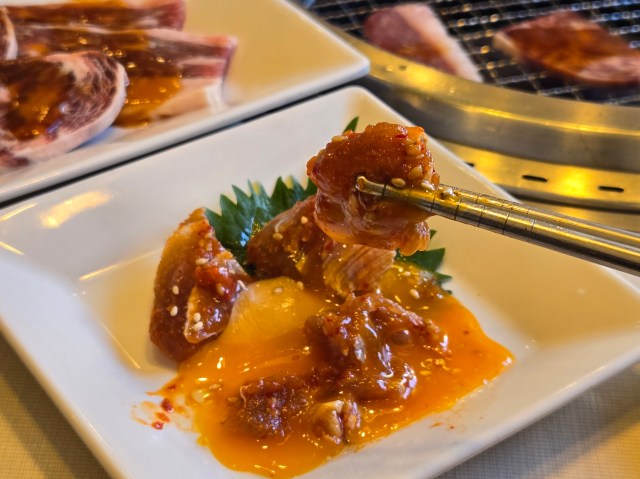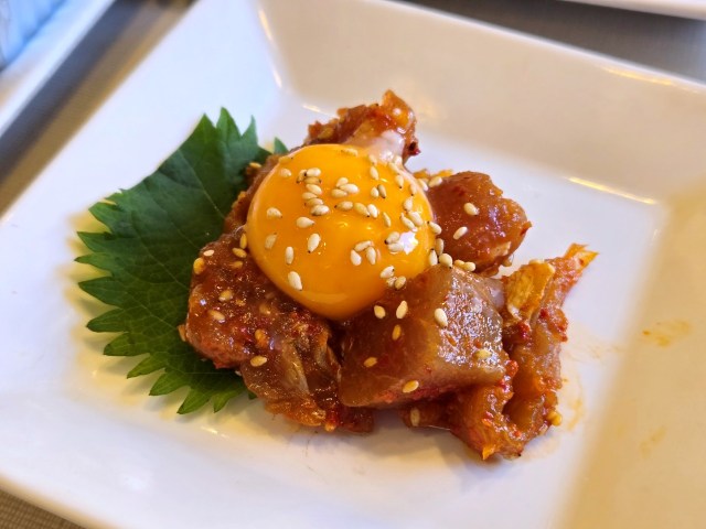 一方で、ユッケは思っていた以上に良いぞ! まぐろの質はそんなに良くないんだけど、味付けがさっぱりピリ辛で、こってりした焼肉の箸休めとして最高なのだ。
