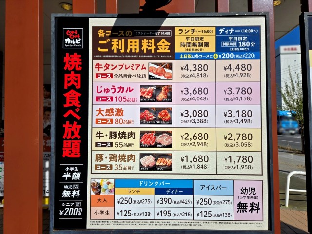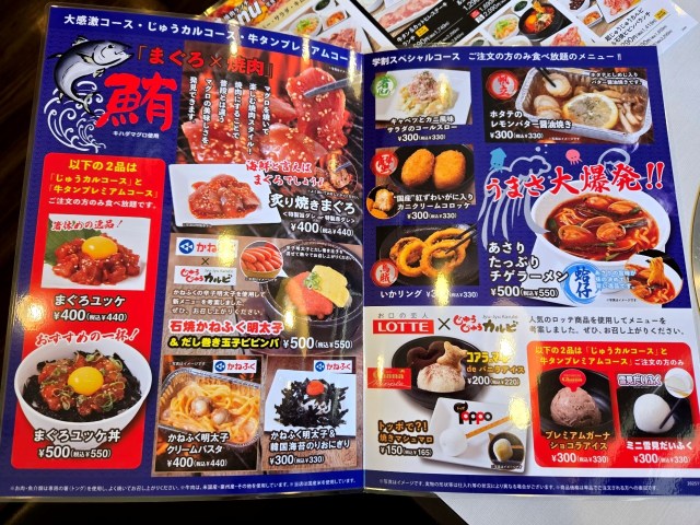 じゅうじゅうカルビの食べ放題は上記の全5種類。それとは別に「学割コース」というのも2種類存在する。