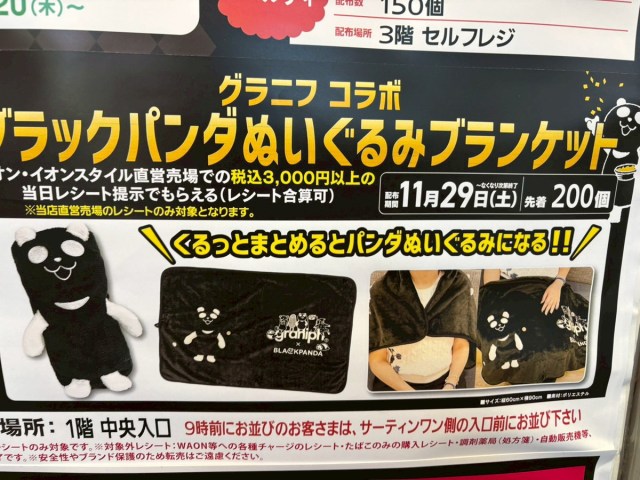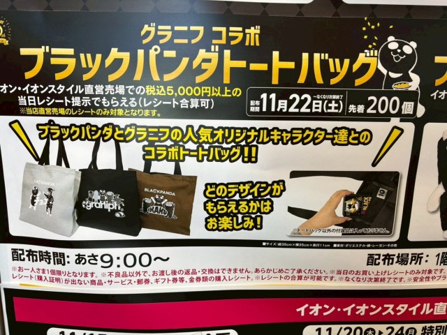 第一弾は11月22日からで税込み5000円以上購入で、グラニフのオリジナルキャラクターとイオンのブラックパンダがプリントされたコラボトートがもらえるのだ。配布数量は店舗によって異なるが、私が購入した店舗は先着200名。