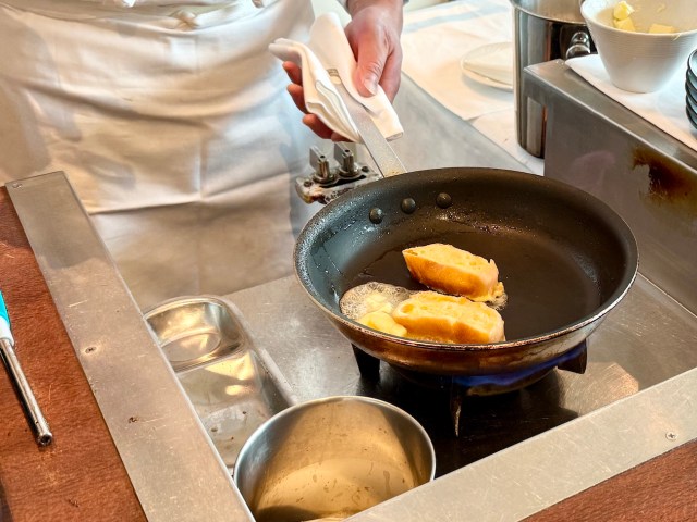 モーニングビュッフェの目玉は、セルフカスタマイズのフレンチトーストだそうだ。目の前でシェフが焼きたてのフレンチトーストを作ってくれて、好みの具材でアレンジして楽しむメニュー。これは絶対に頼むしかない。