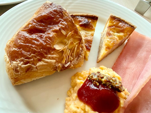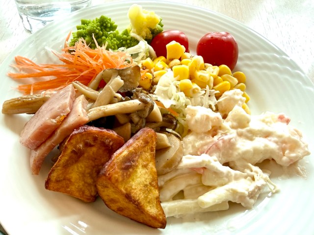 そんなわけで、アーモンドデニッシュやサラダを選んでみた。さらにオムレツ、豚の角煮、サツマイモとキノコのソテー、スムージーも追加。