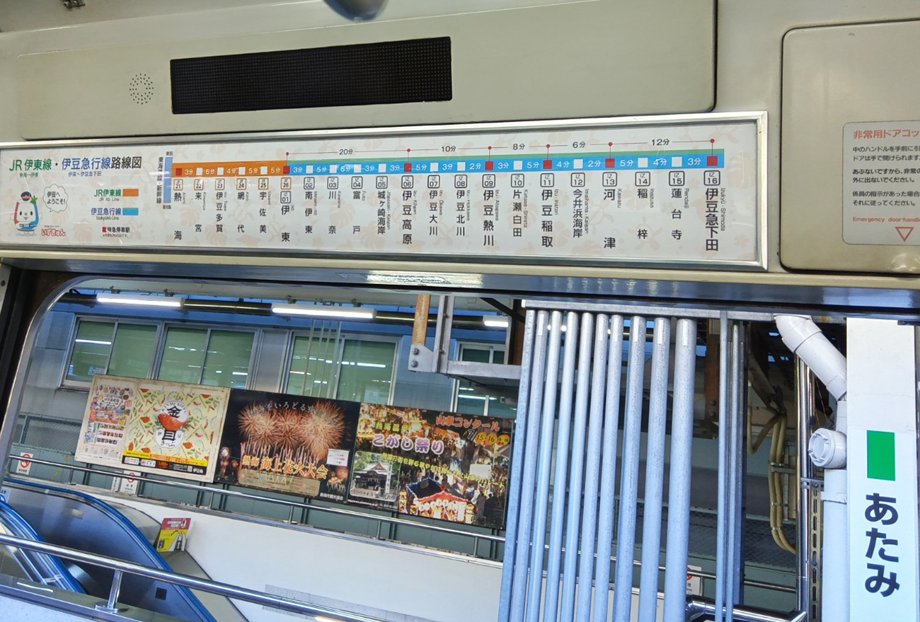 伊東線に乗りかえても満席継続。クッ、まだか……! 伊東で伊豆急行線に接続して終電の「伊豆急下田駅」まではこの電車。計20駅である。まだまだ先は長い。だが、諦めるわけにはいかない。すべては関東最強の避寒地にたどり着くために!