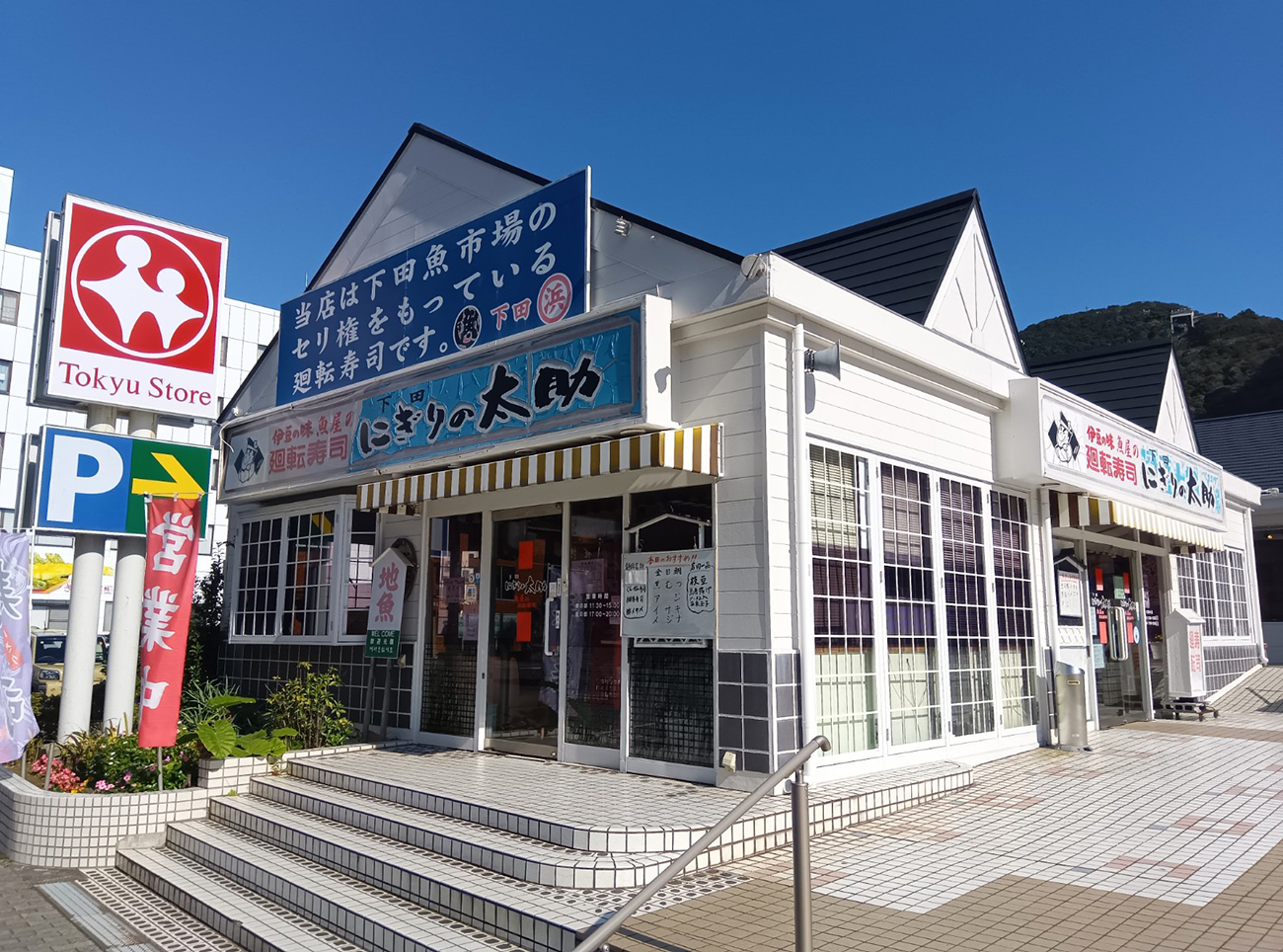 駅前の通りを歩いてたら地魚の回転寿司屋『にぎりの太助』があった。寿司職人が握るグルメ回転寿司で、下田魚市場直送。この日の地魚は金目鯛(税込792円)、ムツ(税込473円)、メジナ(税込473円)、イサキ(税込396円)、アジ(税込308円)だった。