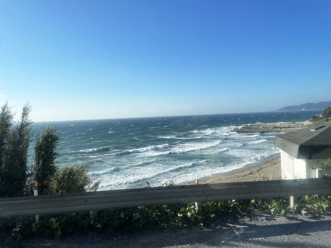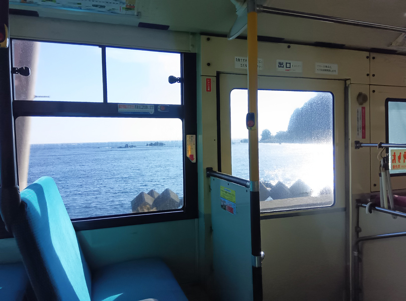それにしても、私が乗っている東海バスの景色がなかなか凄い。先っちょに向かってるだけあって車窓を流れる海のキラキラが迫って来るようだ。圧倒される海っぷりである。こんなにダイナミックな景色のバスはあんまりないんじゃないだろうか。