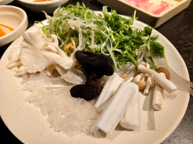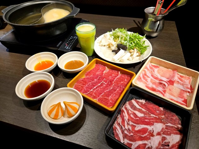 お肉を注文し、具材もとってきて準備完了! お肉は手前からラム、牛みすじ、黒豚。脂の入り方が良い感じで、どれもとてもおいしそうに見える。