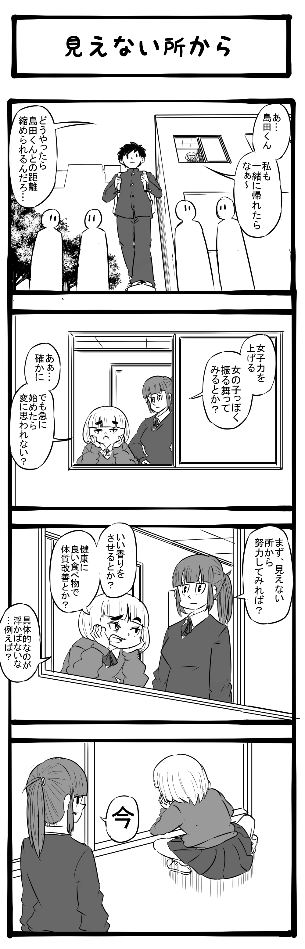 ブチ上れ女子力! 恋する友人に助言をする女生徒! 四コマサボタージュBYD第244回 「見えない所から」