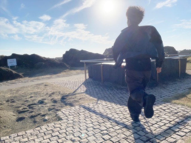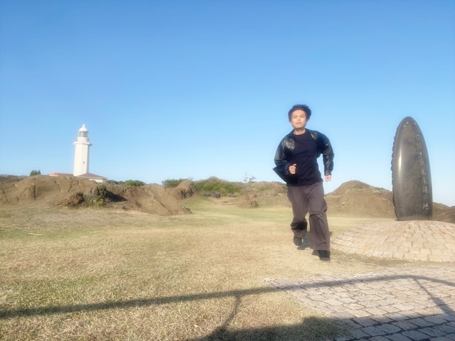 ──千葉の最南端で何をやっているんだ私は。もちろん撮影はすべてセルフである。とんでもない強風で三脚が吹っ飛ぶ上に、西日が眩しすぎてカメラの画面がよく見えない。