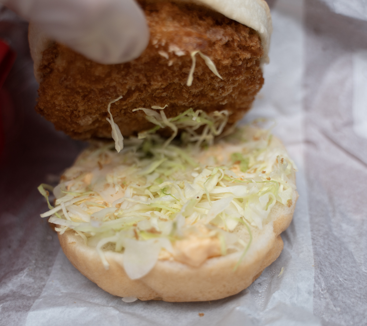 トップのバンズの下には、新作のウリであるデミグラスフィリング。いささか量が心もとない気がするが、やれるのだろうか。
