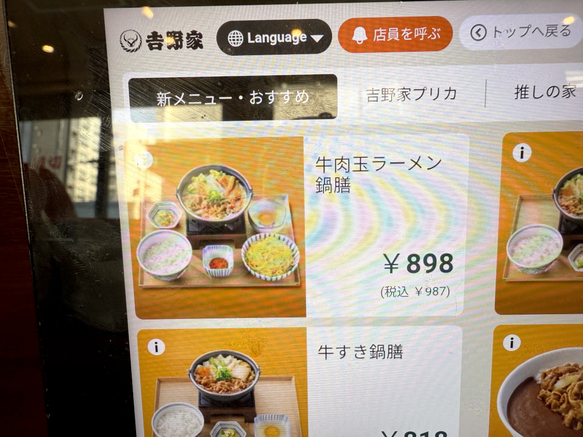 というわけで、最寄りの吉野家で『牛肉玉ラーメン鍋膳(とんこつ)』をオーダー。価格は1人前987円で、ご飯とお漬物なしの単品が899円となっている。