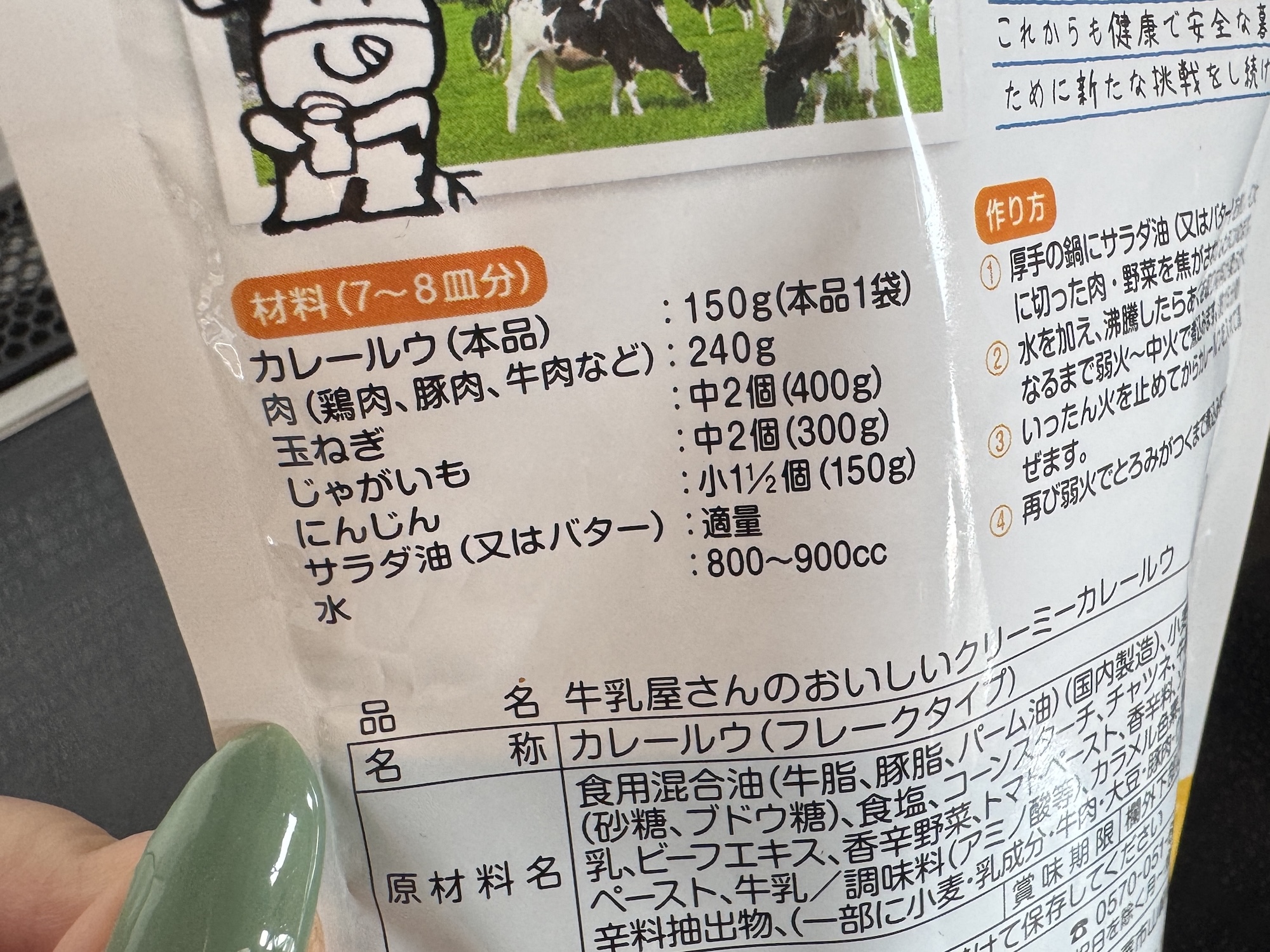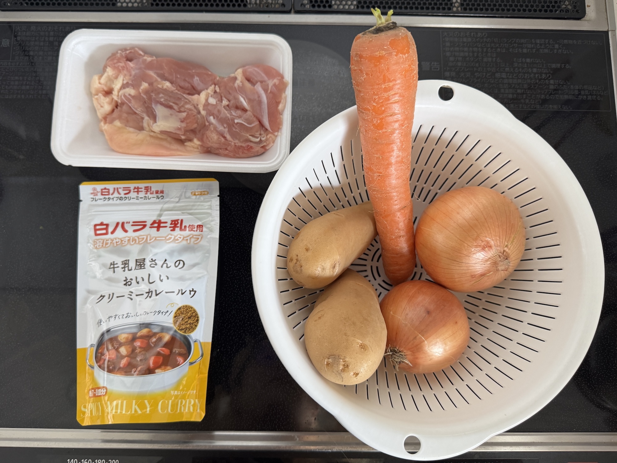 材料は肉、玉ねぎ、じゃがいも、にんじん。至極普通のカレーの材料である。なお牛乳は必要ない模様。