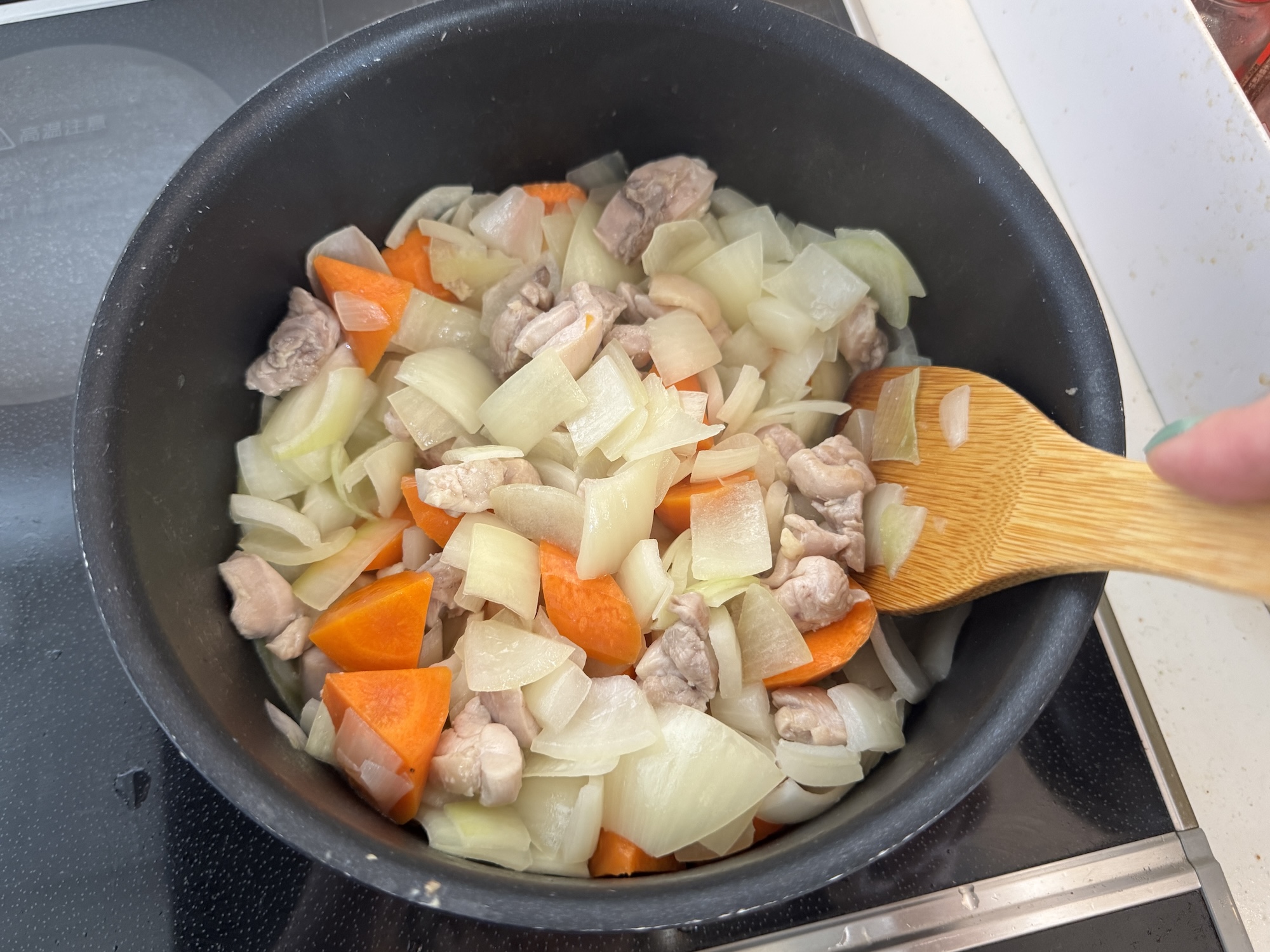 油で肉と野菜を炒め、水を加えて煮込む。