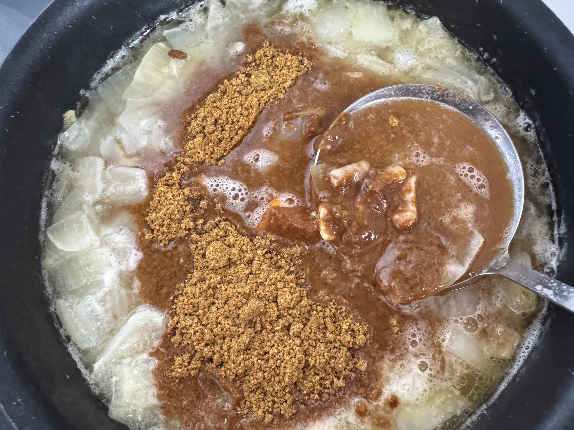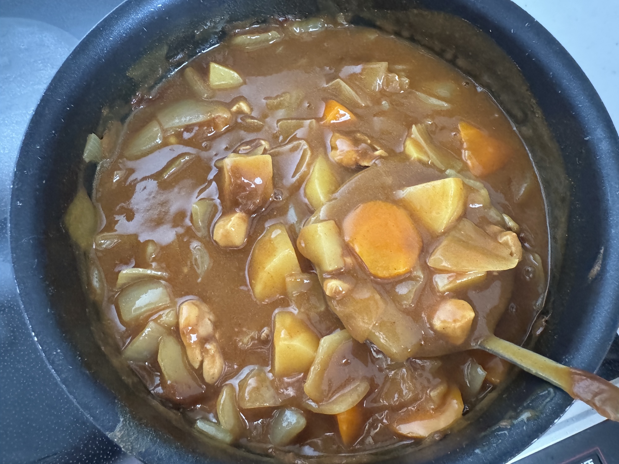 いったん火を止めルウを溶かし、再び弱火で煮込む。よくあるカレーの作り方と完全に一致。