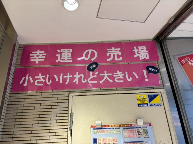 店頭では、1等が出たことを大々的にPR。「幸運の売り場 小さいけれど大きい」の文字がなぜか神々しい。