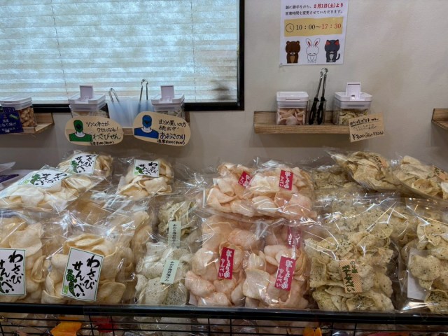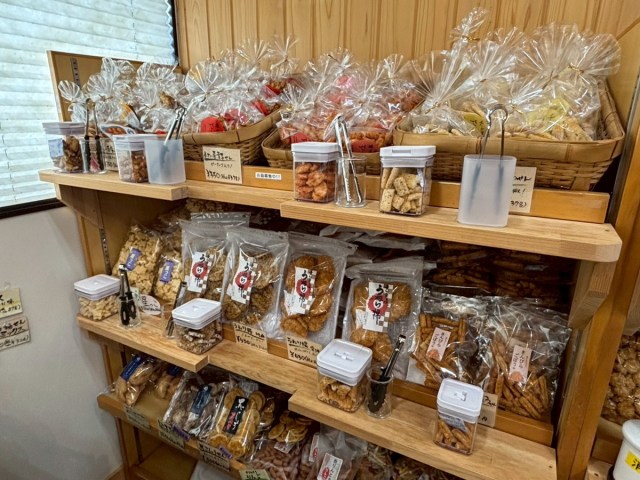 隣接する工場で製造された米菓を、直売店ならではの価格で購入できる人気スポットだ。訪問したこの日も、地元の常連らしき人たちが入れ替わり立ち替わり来店していた。