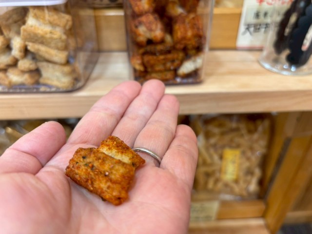 店に足を踏み入れた瞬間、まず目に飛び込んでくるのは、ずらりと並んだ試食。ほぼ全部が試食できるという太っ腹ぶりで、せんべい、あられ、おかきなど気になる商品を自由にお試しできる。