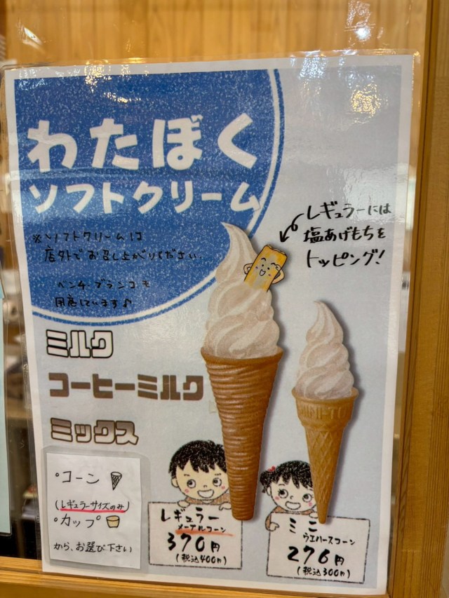 埼玉県民にはおなじみのわたぼく牛乳の味わいが、そのままソフトクリームになっている。コクがあるのに後味が重くないし、塩あげもちのトッピングが絶妙なアクセントになっている。