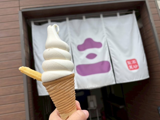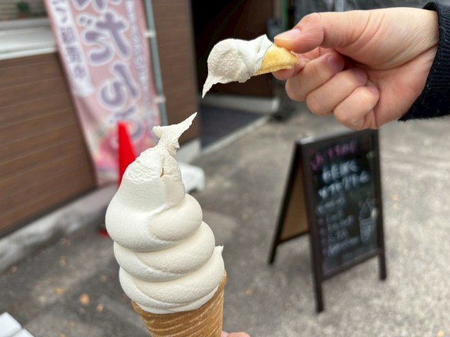 さっそく外のイートインスペースで実食してみる。まずは、わたぼくソフトから。