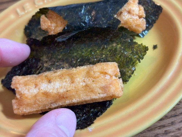 もう一つオススメされたのが、社長の自信作でもあるという「高砂巻き(197円)」。店舗での写真を撮り忘れてしまったが、さきほどの薪あげに海苔を巻いた商品らしい。こちらは試食がなかったので、期待も込めて購入。