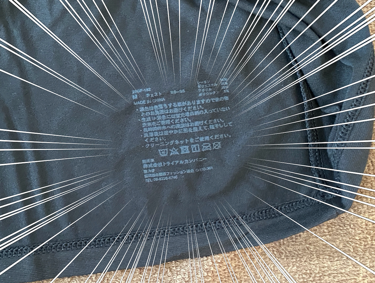 近年ちょこちょこと増えているが、タグついてるのが苦手な人からすると嬉しい仕様だ。ちなみに素材はレーヨン34%、ポリエステル33%、アクリル28%、ポリウレタン5%であった。