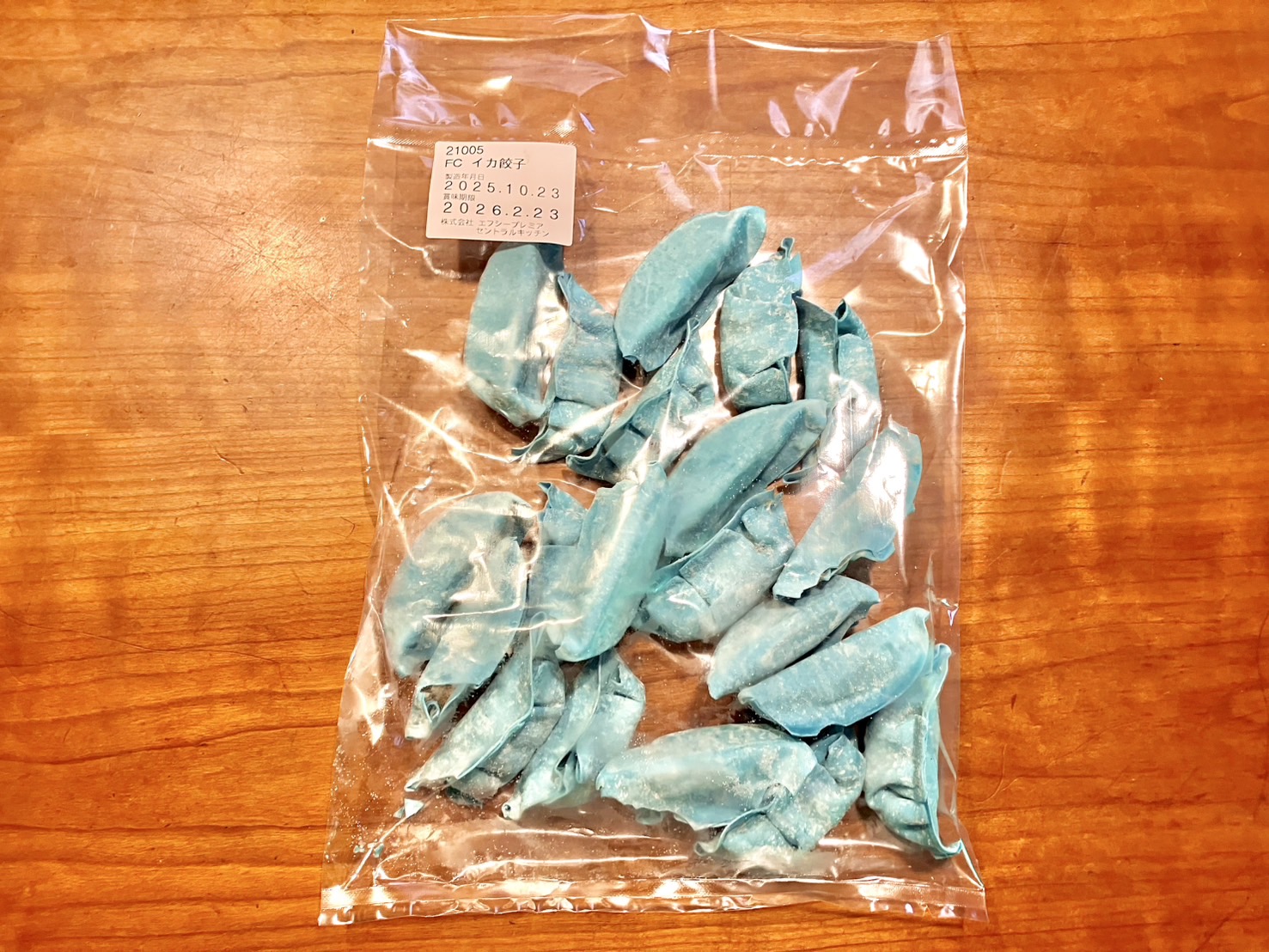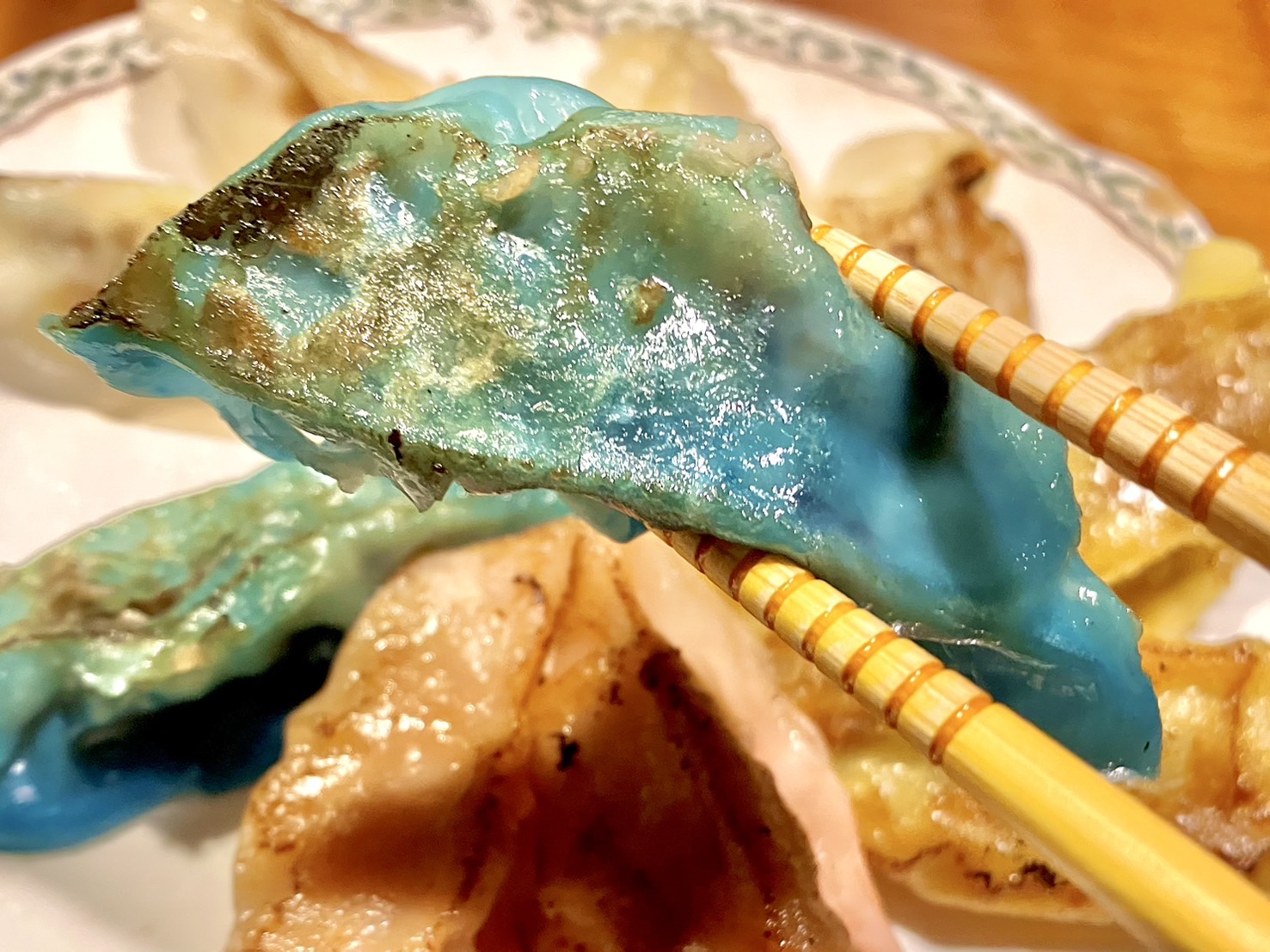最後はいちばん気になっていた「イカ餃子」。鮮やかな青色に一瞬躊躇してしまうけれど……