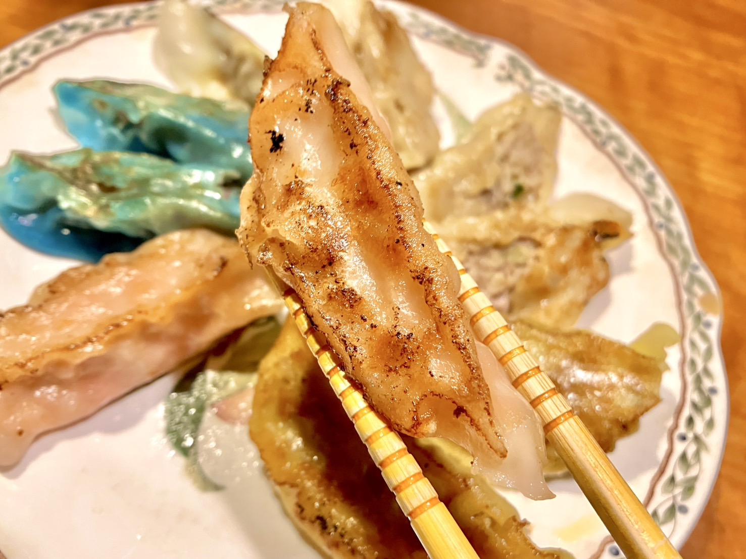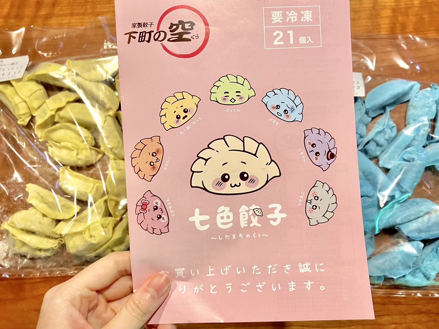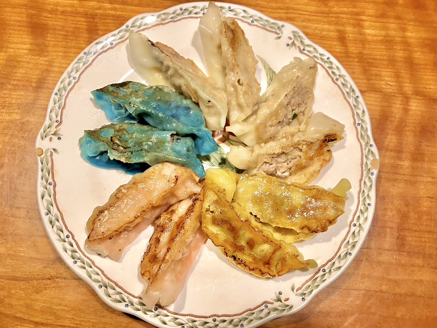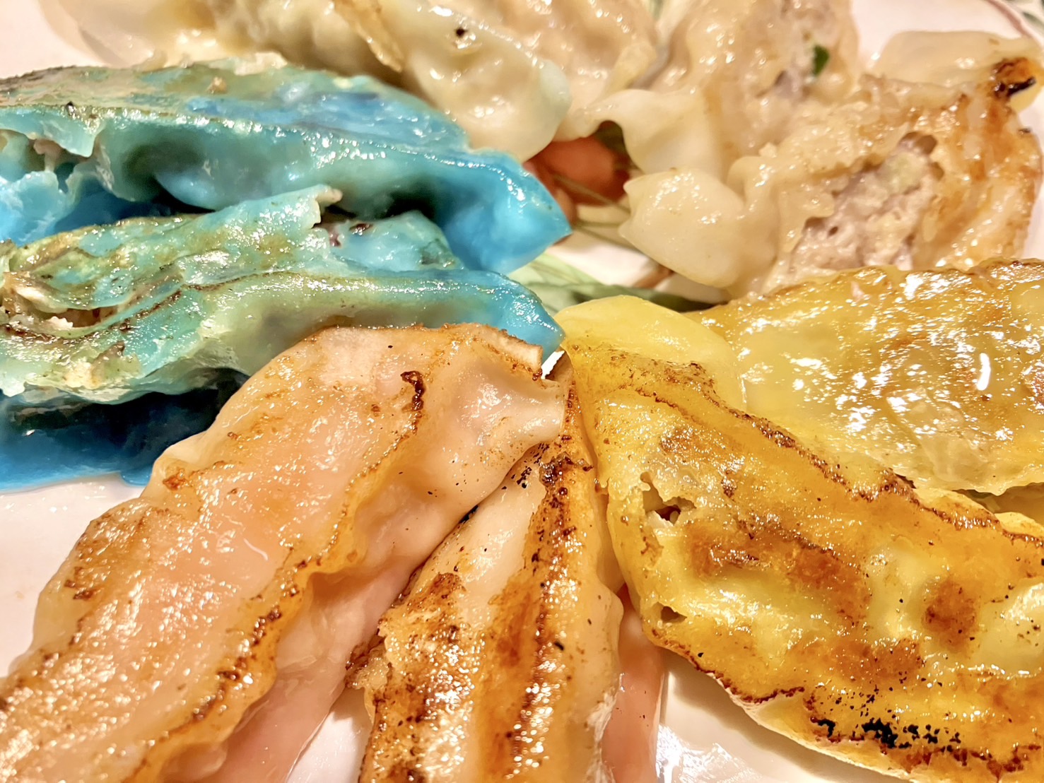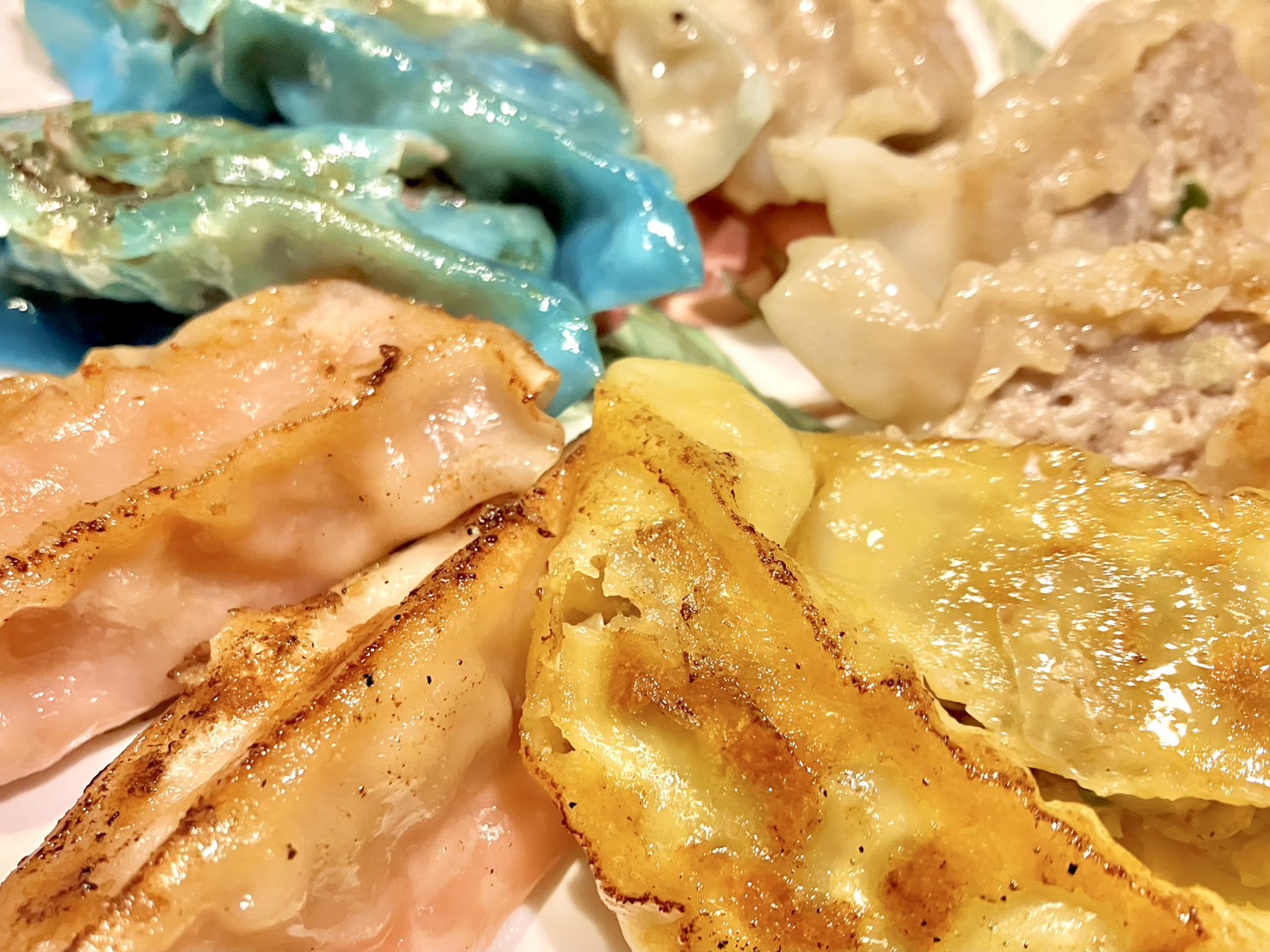 ▼色がついている餃子は「七色餃子」というらしい。キムチやパクチー、しそなど他にもいろんな味があるようだ