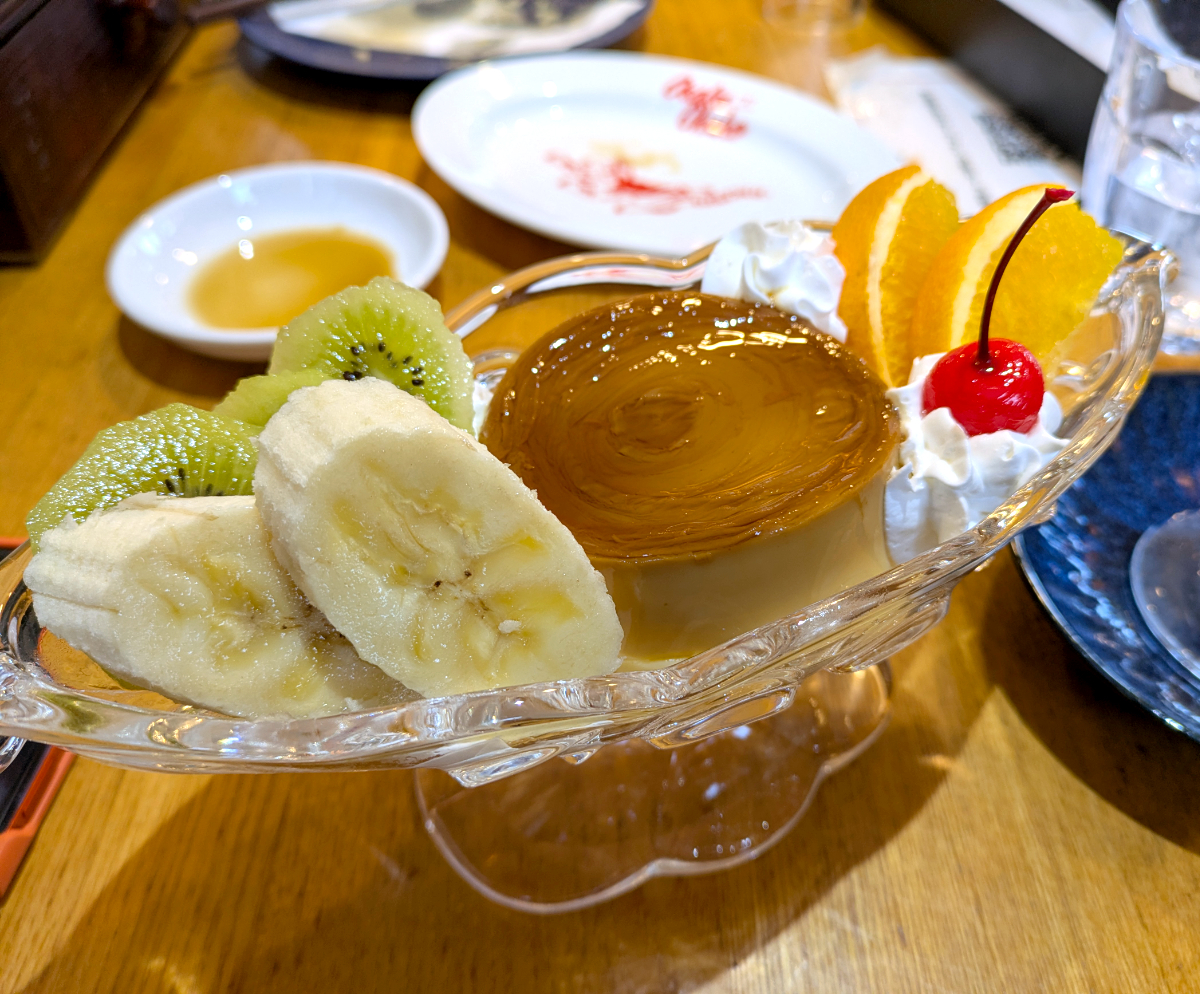 そしてメインディッシュ(?)の「王将プリン・ア・ラ・モード」(税込810円)。あらためて確認するけど、ここ大阪王将だよね? 中華料理店だよね? レトロ喫茶店じゃないのに、このクオリティ。プリンもさることながら、フルーツの飾り切りもちゃんとしてるなあ。