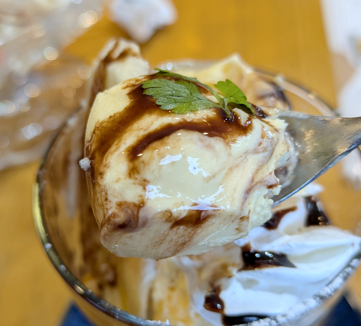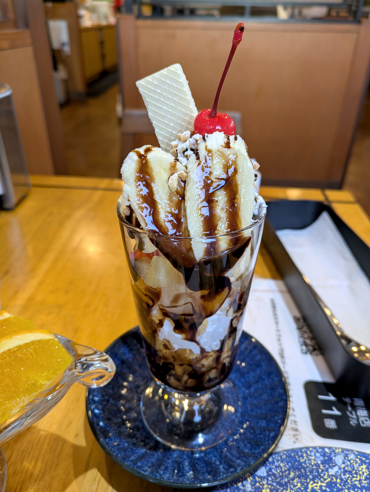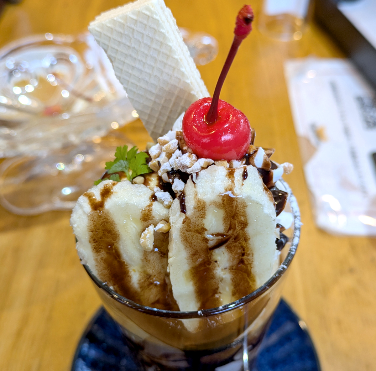 中身は下からコーンフレーク・ホイップクリーム・バニラアイス・カットフルーツ・バナナ・ホイップクリーム。そしてウェハースである。これもまたレトロ喫茶に対するリスペクトを感じる仕上がり。決して派手さはないものの、チョコパに必要なものをしっかりおさえている。