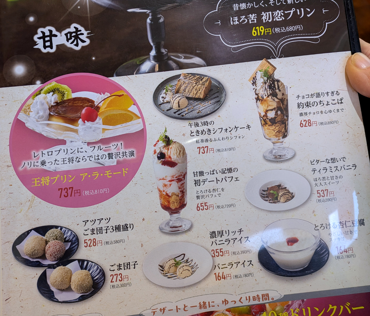 さらにこのお店の最大の特徴は、スイーツが充実していること! 大阪王将なのに、プリンやパフェ、シフォンケーキまであるじゃないか。料理を頼まずに、これらとドリンクバーでカフェとしても十分に使える。