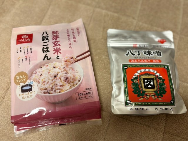 1日の始まりは食事からである。まずは 8 が名称に入っている、八丁味噌の味噌汁と八穀米を用意することに。