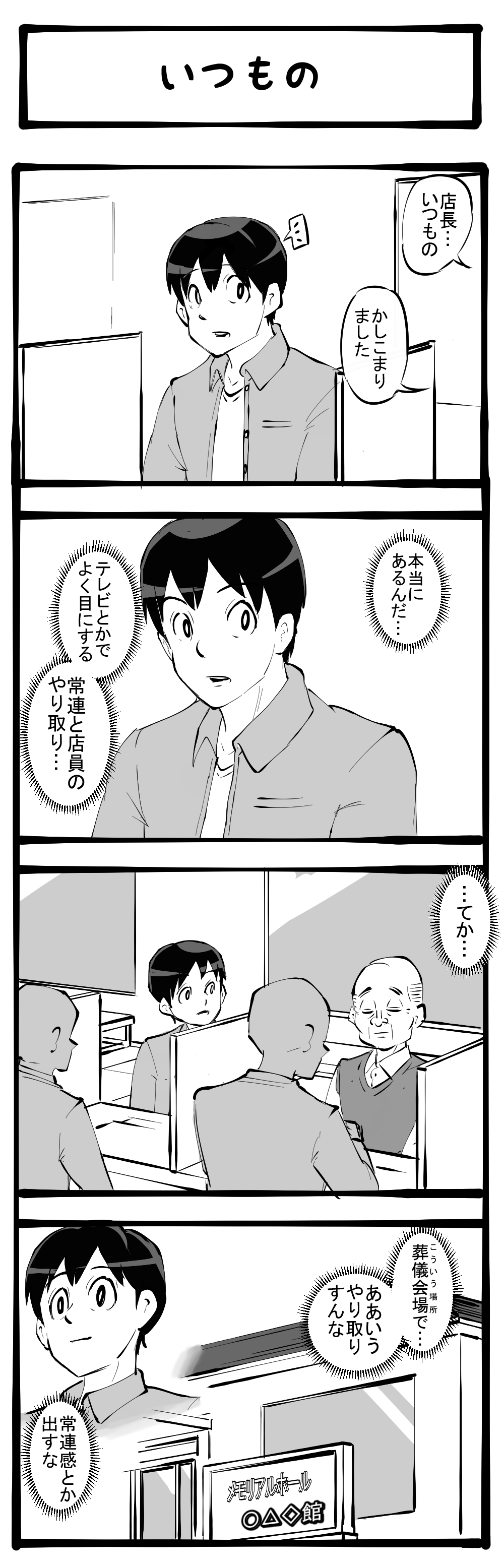 こなれてる感出すな! 常連が言いそうなあのセリフ! 四コマサボタージュBYD第247回「いつもの」