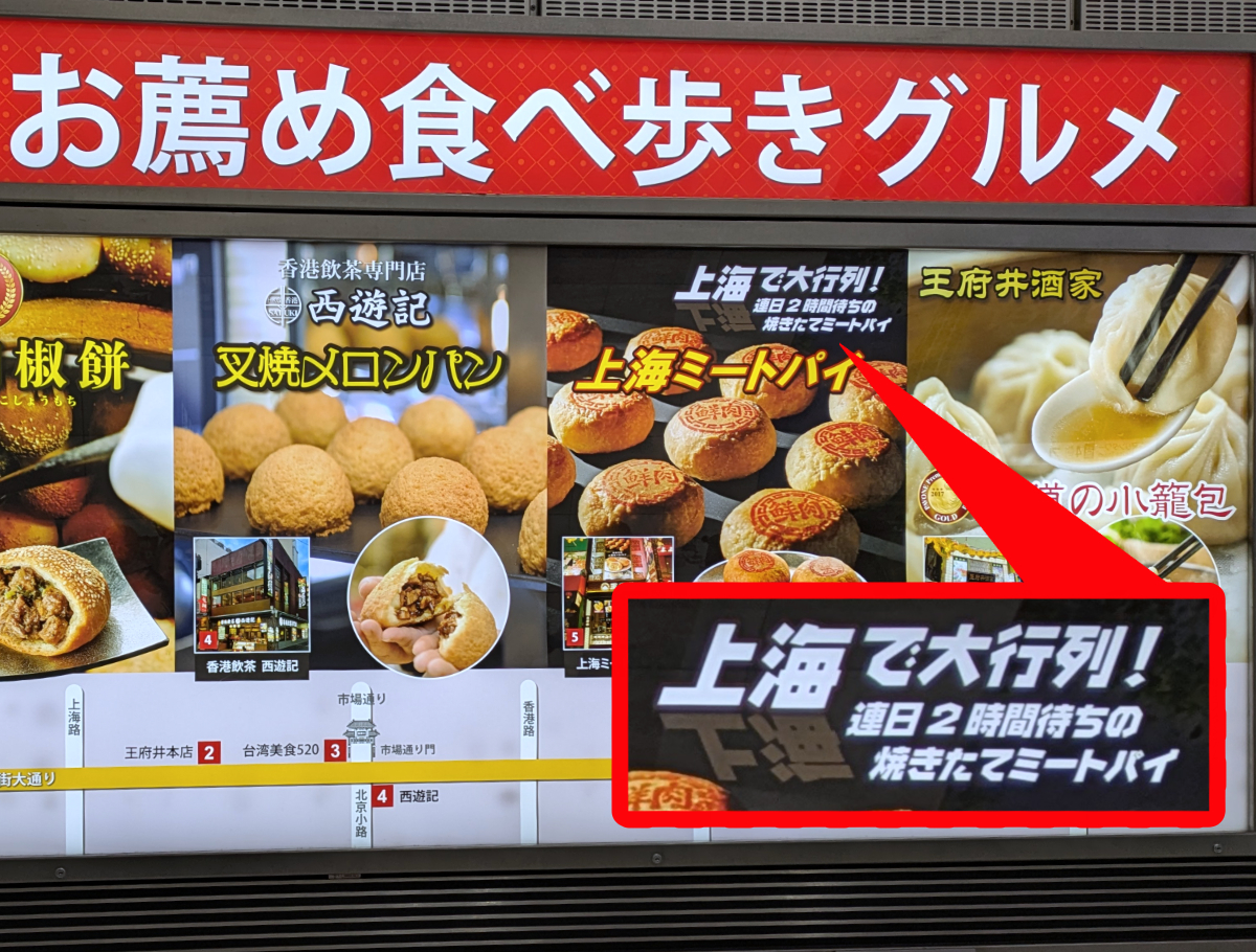 さて、みなとみらい線の元町中華街駅を出ると、改札を出てすぐのところに人気のお店の看板があった。「上海ミートパイ」のお店は上海で人気で、連日2時間待ちとのこと。