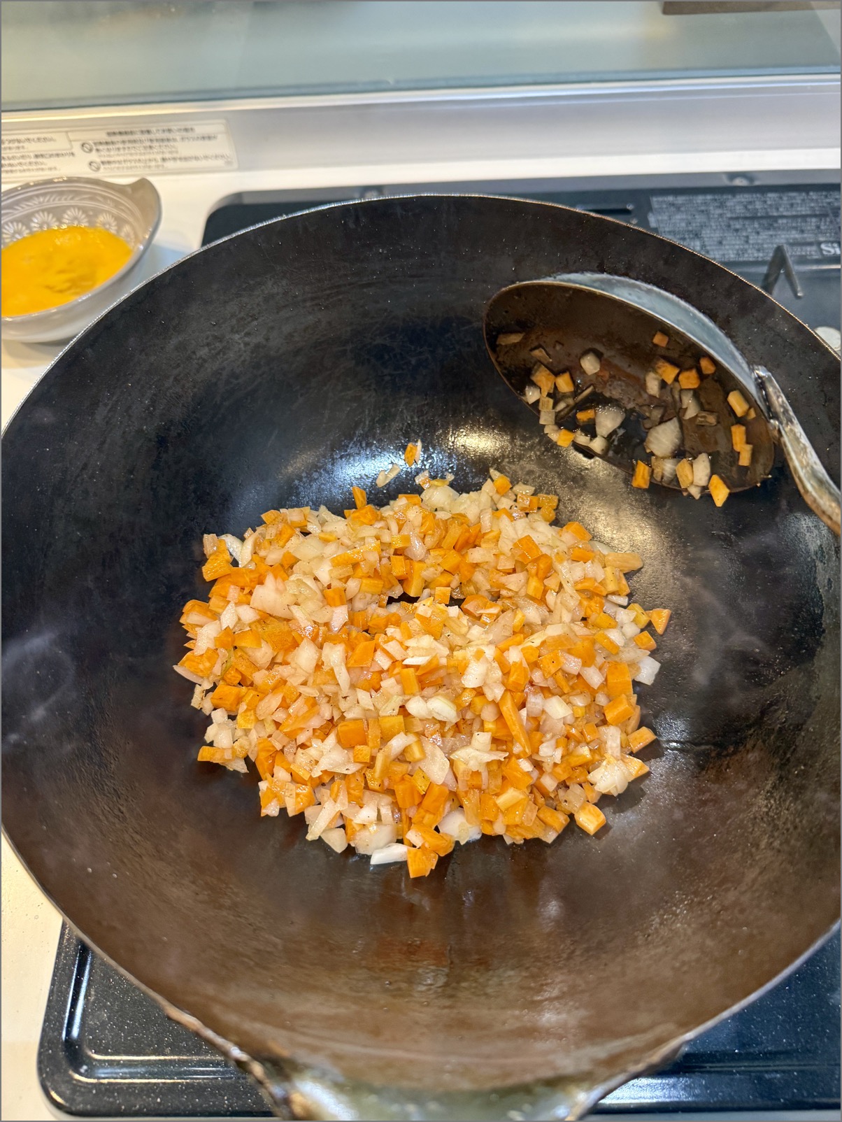 2:油を加え、玉ねぎとにんじんを炒める。