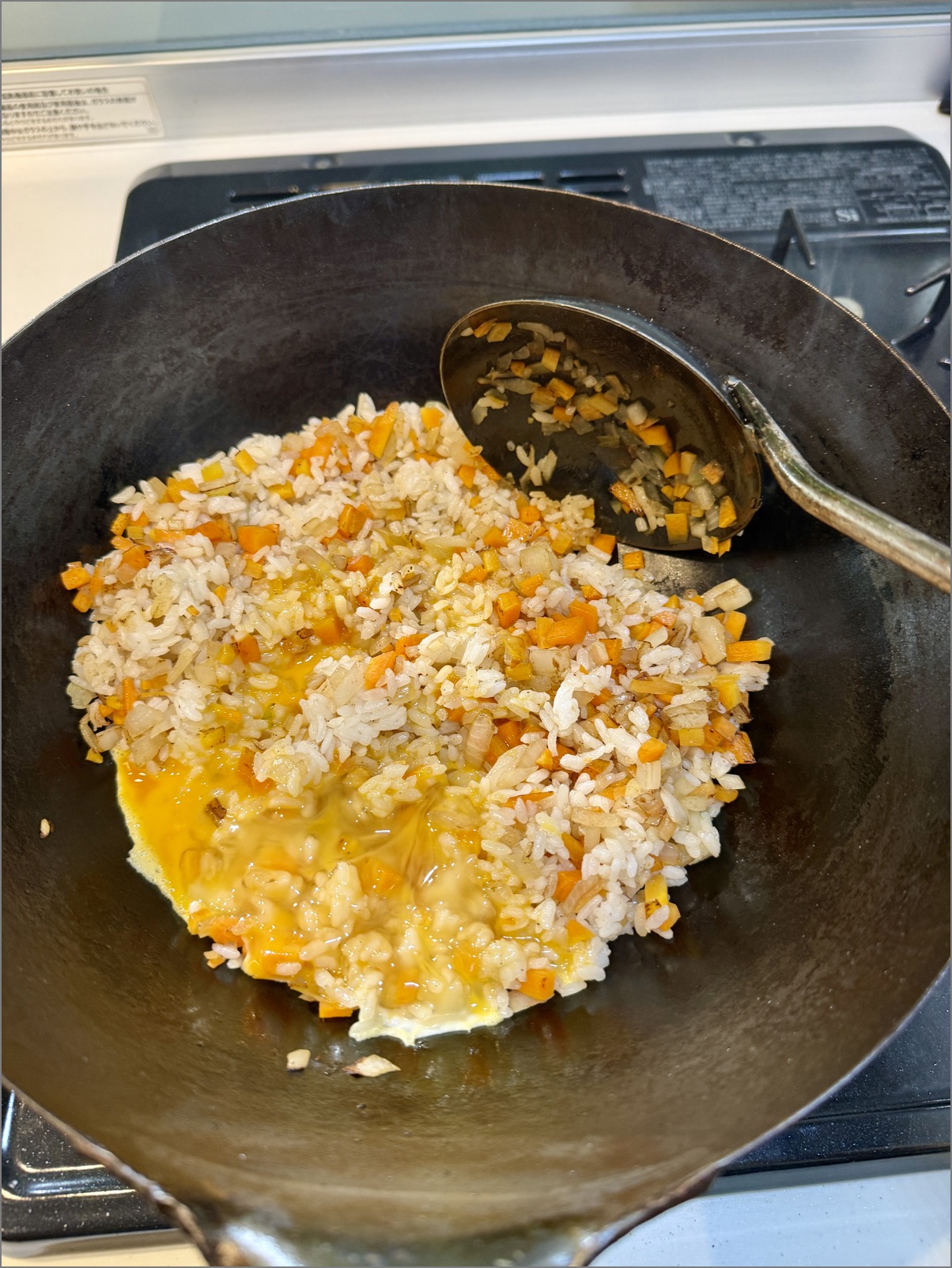4:溶いた卵を入れ、混ぜ炒める。炒(チャオ)りまくるとパラパラになる。